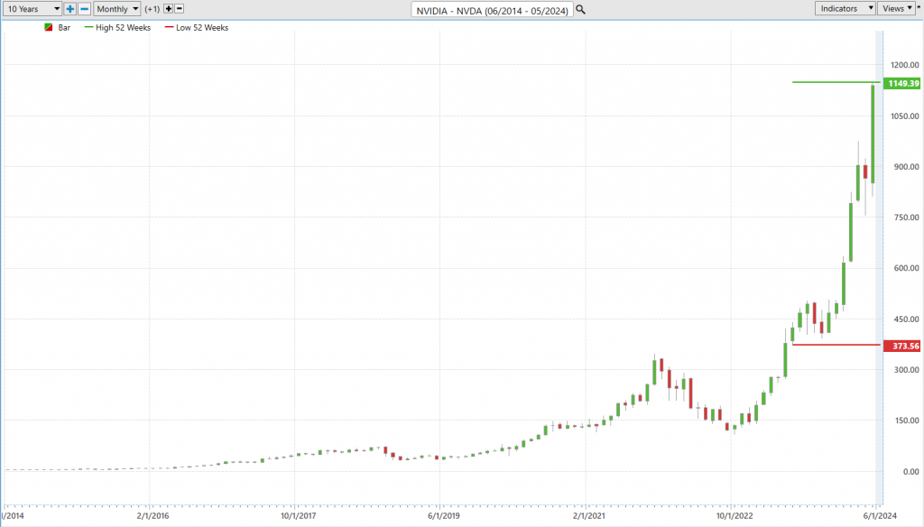 So, as you navigate the market, keep a close eye on these 52-week boundaries. They are your compass, guiding you through the bullish peaks and bearish valleys of stock performance. And always remember, in the stock market, strength often begets strength, and a trend in motion tends to stay in motion until it hits a stopping point. Zooming out to the 10-year chart shows you how explosive the move in $NVDA has been this past year.