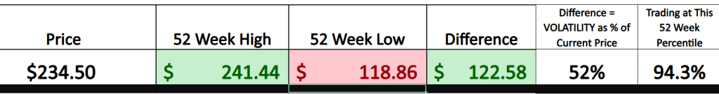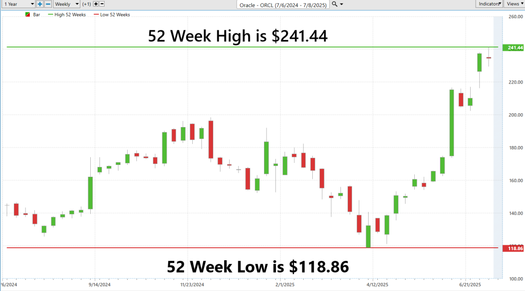 Take a look at Oracle ($ORCL). Right now, it’s trading at $234.50, which places it 94.3% of the way toward its 52-week high of $241.44. That alone should raise your eyebrows. Why? Because stocks that live in the top decile of their annual range are telling you something loud and clear: they’ve got momentum. Traders and institutions are piling in. There’s conviction.