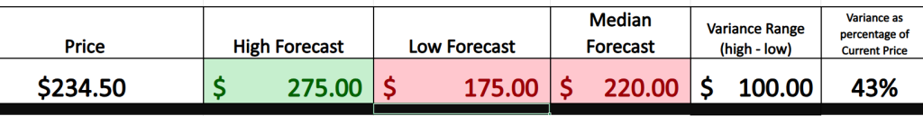 Alway pay attention to the variance between the most bullish and most bearish forecast as this metric communicates the expected volatility moving forward. Currently this variance stands at 43% which is very high.