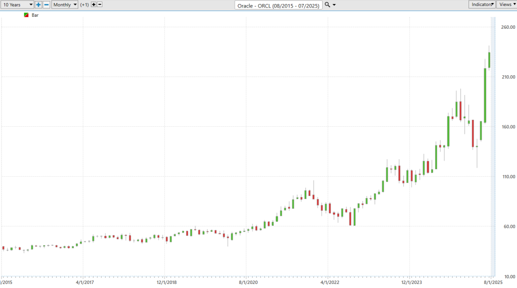 But here’s what really matters: over the past few months, ORCL hasn’t just reclaimed old highs—it’s smashed through them. It’s now printing new all-time highs on both the 1-year and 10-year time frames. That tells us this is no ordinary move. It’s a re-rating, a fundamental revaluation by institutions betting big on Oracle’s cloud and AI future.
