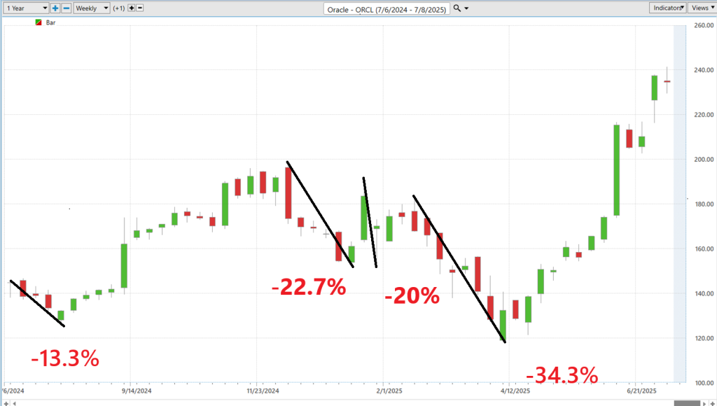 Take Oracle ($ORCL) over the past year. The data doesn’t lie. There have been multiple sharp pullbacks—-13.3%, -22.7%, -20%, and a brutal -34.3% drop. These weren’t statistical noise. These were deep, confidence-shaking moves that would’ve shaken out retail traders.
