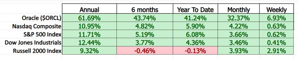 Zoom in tighter. On a monthly basis, Oracle surged 32.37%. That’s not a typo. Meanwhile, the Dow’s barely moving, and the Russell 2000 continues to sputter like an old engine on a cold morning.