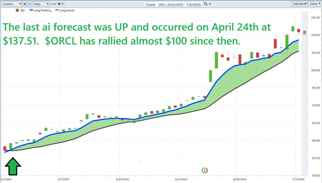 Since that signal, Oracle has surged nearly $100—a gain that doesn’t just outperform the market, it redefines what leadership looks like in the current cycle. The forecast wasn’t a guess—it was an informed, algorithmically derived signal that cut through volatility and positioned traders early in one of the year’s most impressive rallies.