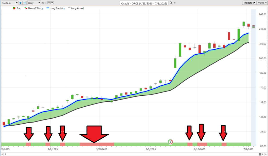 Let’s cut through the hype and get right to the core of what we’re seeing here. Those red down arrows on the chart? They’re not random. They’re not hunches. They’re neural index warnings—and they come straight from a machine that doesn’t blink. Every time the neural index flashed red it is a short-term forecast that the market is overextended and will pull back to the predictive blue line.