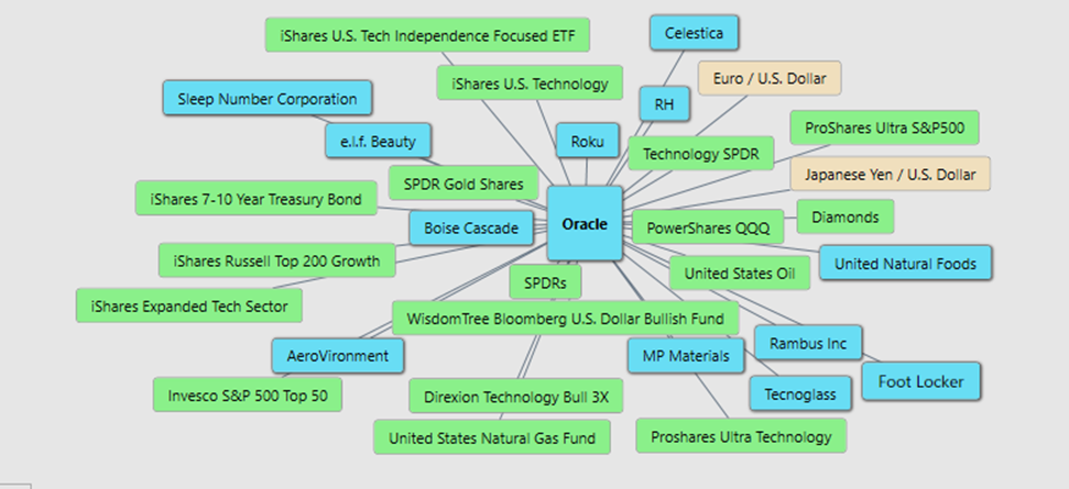 Then you’ve got your broad market barometers—SPY, DIA, SSO, IWY, XLG. These tell you how the overall market feels about risk. When Wall Street’s feeling good, when the indexes are rallying, Oracle’s right there climbing the ladder. But if the market turns cautious, big-cap names like ORCL don’t get a free pass—they feel the heat. And don’t ignore the leveraged ETFs like TECL and SSO. These aren’t for the faint of heart—they exaggerate the trend, giving us a crystal-clear read on momentum and conviction.