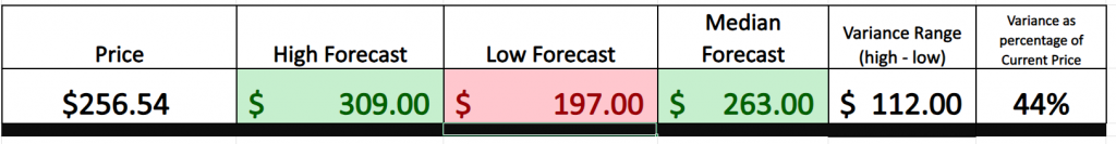 The wide gap between the most bullish and bearish forecasts for a stock by Wall Street analysts, expressed as a percentage of the current price, serves as a crucial indicator of potential volatility and diverse analyst opinions. This spread at 44% or $112 highlights uncertainty or differing perspectives on the stock’s future performance, signaling that the market might expect significant price movements. Paying attention to this range can help traders gauge the level of risk and possible reward associated with the stock, making it a vital aspect of decision-making.