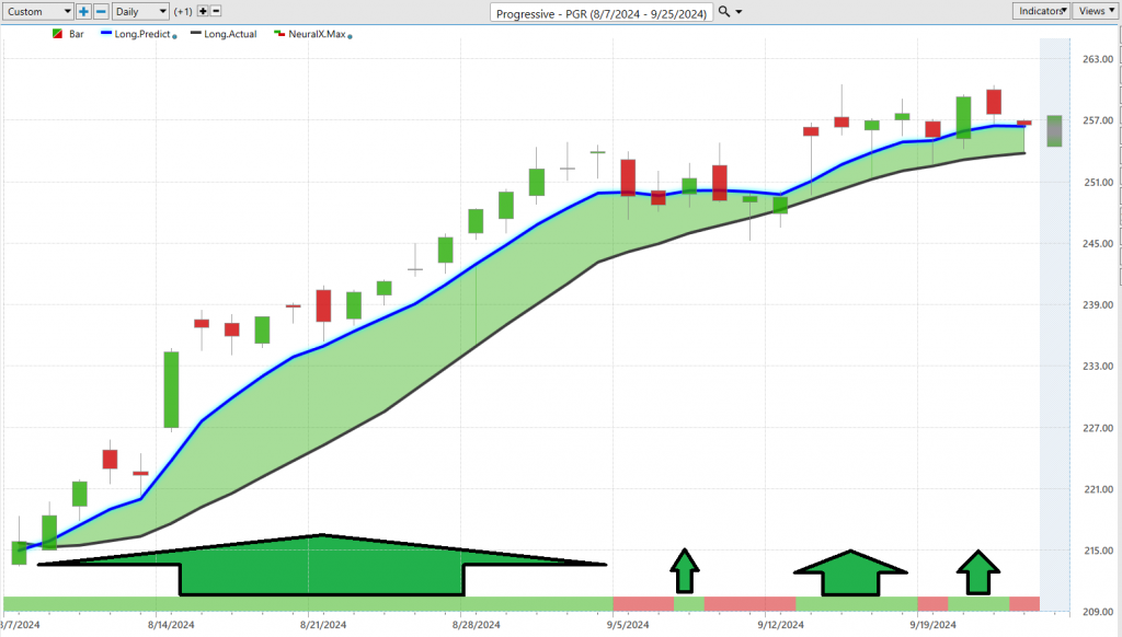 Let’s delve into the complex realm of A.I.-driven market predictions for Progressive ($PGR) in the software domain. Central to our analysis is the predictive blue line—a robust amalgamation of artificial intelligence with intermarket data, poised to decipher emerging market trends. This line is not merely a tool; it serves as a compass through the tempestuous seas of financial markets.