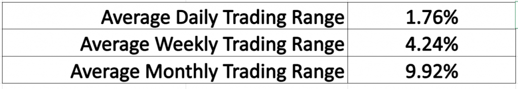 Now, let’s get practical and examine how these average trading ranges play out daily, weekly, and monthly. Over the past year this is what the average trading ranges for these time frames have been.