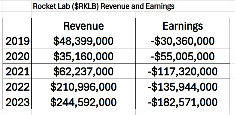 Despite such vigorous revenue growth, achieving profitability remains a complex challenge in the high-cost realm of aerospace. However, with robust cash reserves of $442.39 million and a hefty $1.05 billion order backlog, Rocket Lab is well-primed for future ventures. This financial muscle is critical as they balance commercial pursuits with governmental contracts, aiming for stability and growth in a volatile market. Their earnings and revenue for the last 5 years are listed below and show that despite massive revenue growth they have yet to achieve any semblance of profitability. This is not uncommon in growth stocks who traditionally reinvest in further infrastructure.
