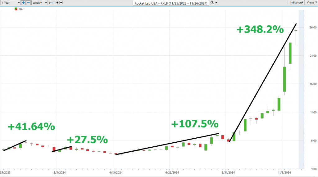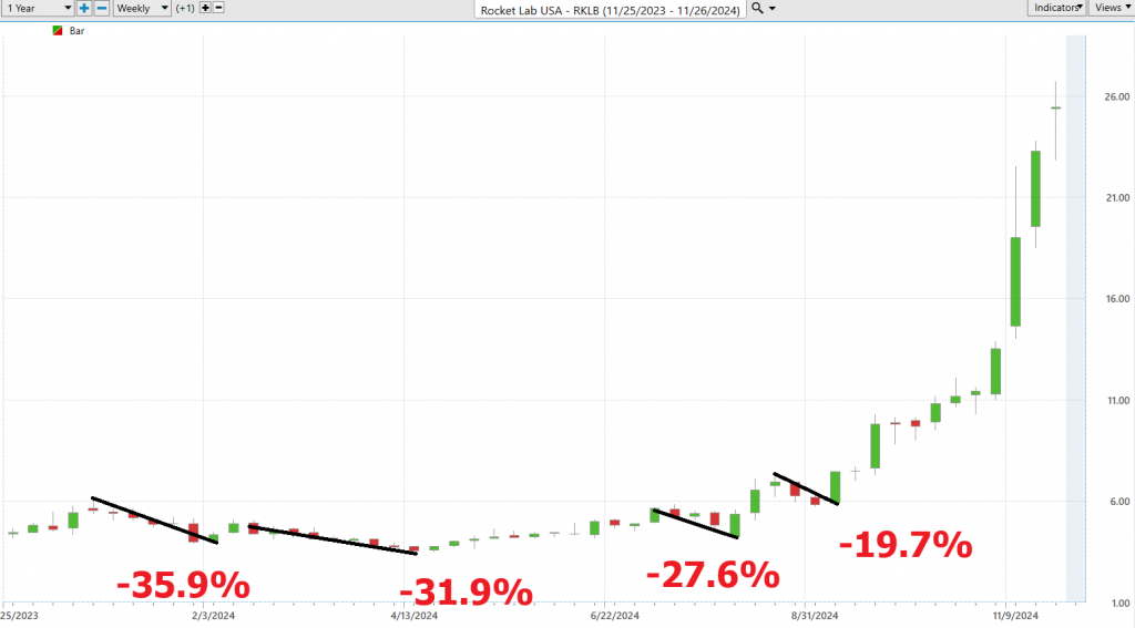 To really understand $RKLB’s ups and downs, we look at its biggest gains and losses over the past year. It is crucial that you measure the magnitude of these moves up and down. The magnitude of the recent rally makes it appear as if the stock just traded sideways for the past year, and this would be a falsehood.
