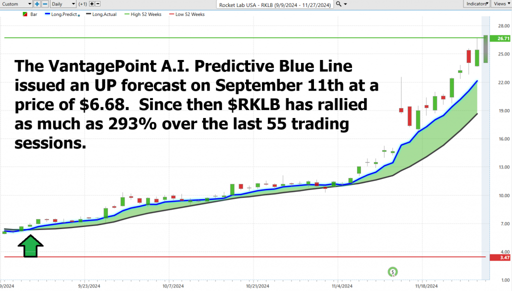Let’s dive into the groundbreaking world of VantagePoint Software’s A.I.-driven forecasts for $RKLB. At the core of the technology is something called the “predictive blue line.” This isn’t just any line on a chart; it’s the result of combining artificial intelligence, machine learning with deep market analysis to accurately predict where $RKLB’s stock price might go next.