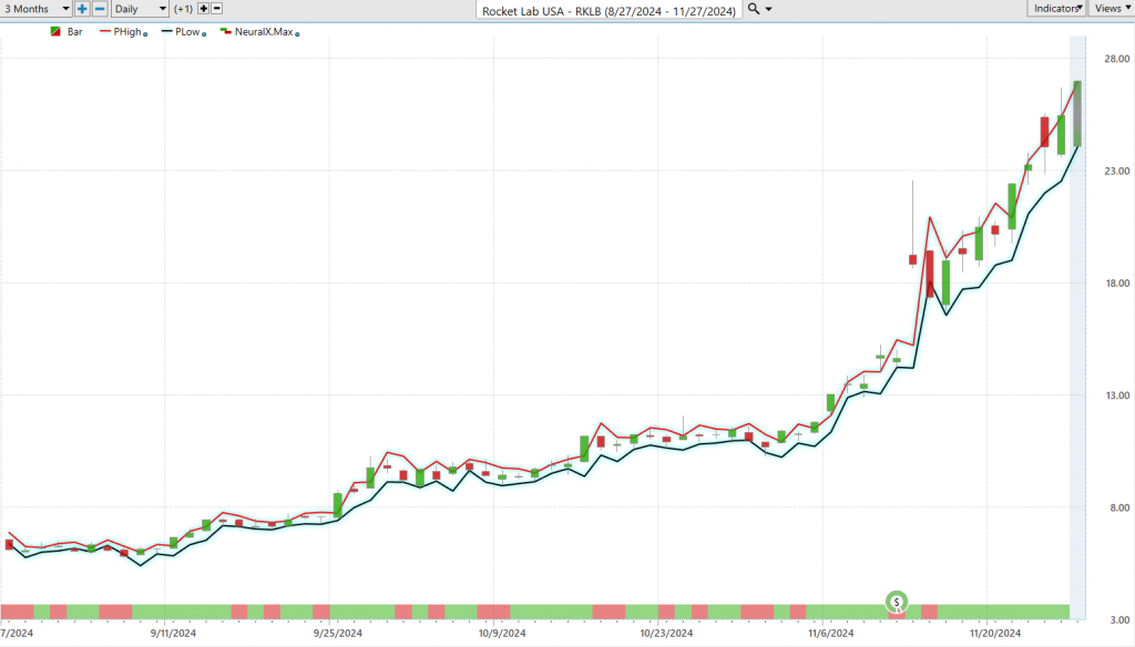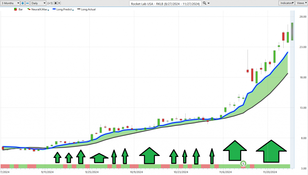 Look at the example below: It highlights times when both the neural index and the predictive blue line align, indicating high potential for successful trades. These moments aren’t just fortunate guesses; they’re supported by thorough analysis from the neural network, presenting prime opportunities for traders to take advantage of. The moments when the Neural Index turns red are traditionally those times when price retraces to or below the predictive blue line. Combining these insights provides traders with a practical, proven and systematic means of anticipating price action for $RKLB.
