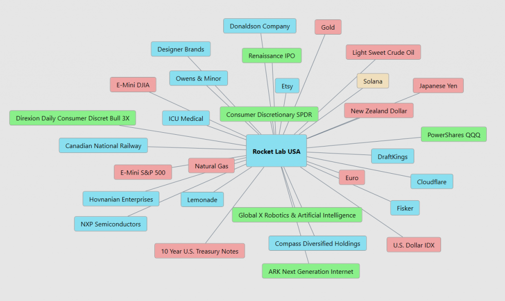 Intermarket analysis for Rocket Lab USA, Inc. ($RKLB) involves examining a diverse array of financial instruments including cryptocurrencies, ETFs, individual stocks, commodities, indices, and forex pairs to predict potential price movements. Elements such as the performance of technology-focused ETFs (e.g., ARKW, BOTZ, QQQ), the impact of global economic indicators reflected in forex pairs (e.g., JY, USD), and commodities like oil and gold provide insights into broader economic conditions and investor sentiment that could affect $RKLB. Additionally, trends in related individual stocks across various sectors (e.g., DKNG, NET) help gauge sector-specific investor confidence and market dynamics. This complex blend of cross-market relationships offers a comprehensive view but requires deep analysis to understand how these diverse factors collectively influence $RKLB’s market behavior.