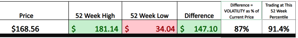 Equally important is we look at the variance between the most bullish and most bearish forecasts to better understand expectations moving forward. Currently this variance is $79 and represents 47% of the current price. This level of expected volatility is high.
