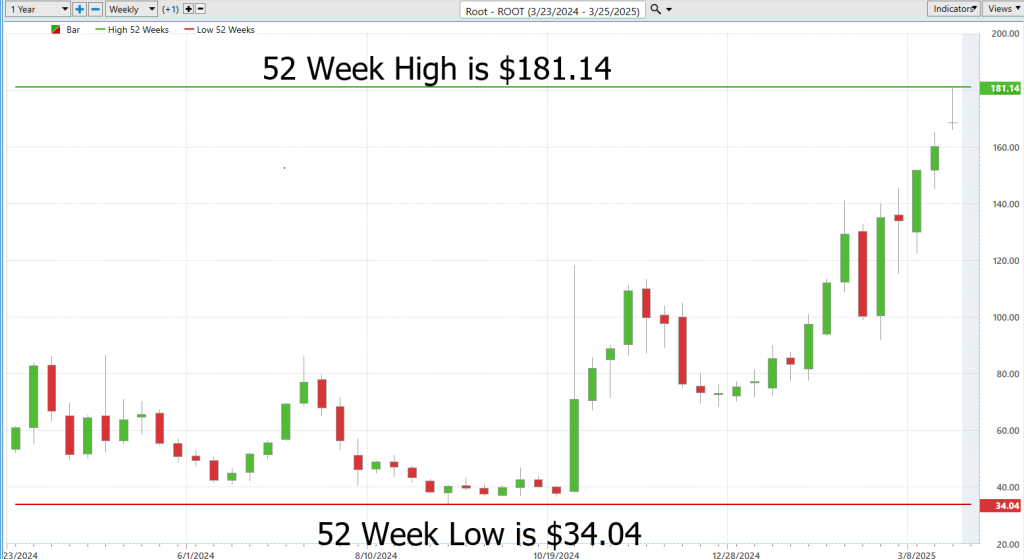 Over the past year $ROOT has traded as high as $181.14 and as low as $34.04. This is an incredibly wide range of $147.10 which represents 87% of the current price. The annual range is the historic volatility and tells us that if the future is like the recent past, we should buckle our seat belts and brace for large swings in terms of price action.