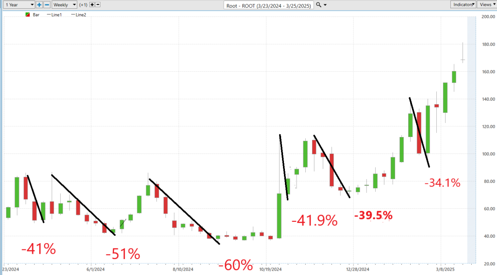 Before you jump into considering trading Root Insurance ($ROOT), it’s critical to thoroughly understand the potential risks and rewards. This is where scenario analysis proves its worth, especially for those considering investing in Root Insurance. An effective approach here involves comparing the magnitude and durations of Root’s stock rallies against its downturns. By charting these trends, traders get a clear visual of Root Insurance’s performance, offering a reliable basis for understanding volatility.