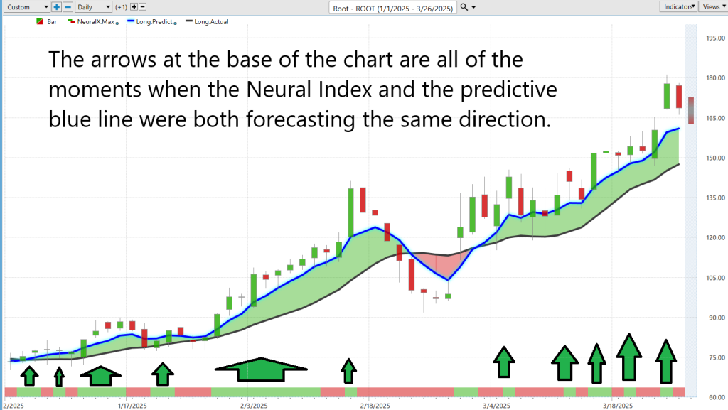 Imagine entering the trading fray with an ally that significantly enhances your competitive edge—this is the leverage provided by VantagePoint Software’s A.I.-driven forecasts, now tailored for Root Insurance ($ROOT). Think of it as a high-tech confidant in your corner. The software’s predictive blue line acts much like a sage advisor, steering your buy and sell decisions with extraordinary accuracy.