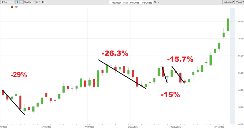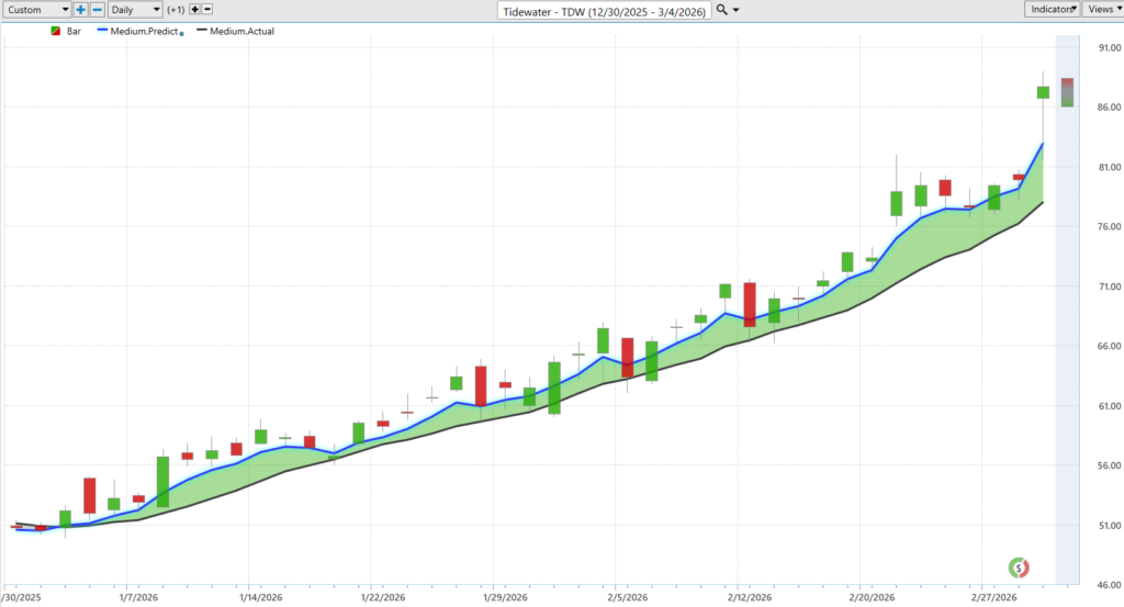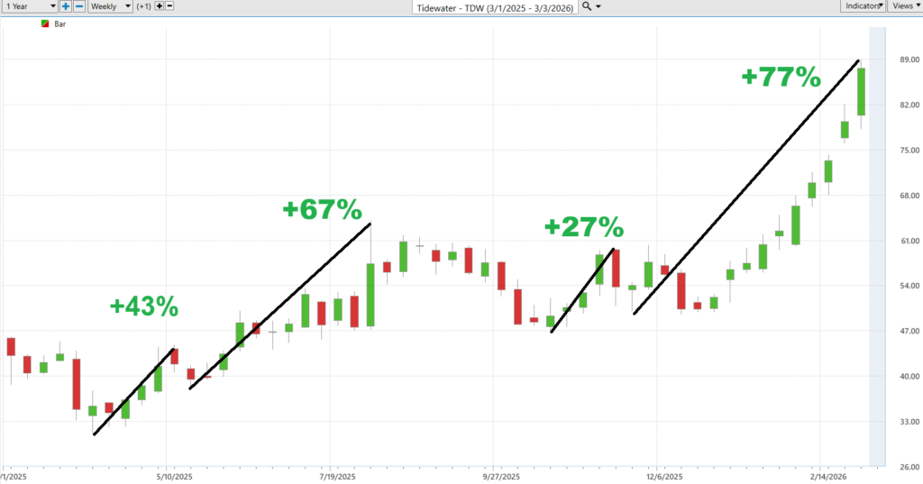 Then the character of the price action shifted. Higher lows began to appear, momentum strengthened, and buyers gradually gained control. What had been a range-bound debate turned into a directional move as investors recognized that offshore activity was improving and that Tidewater’s earnings power was expanding alongside it.