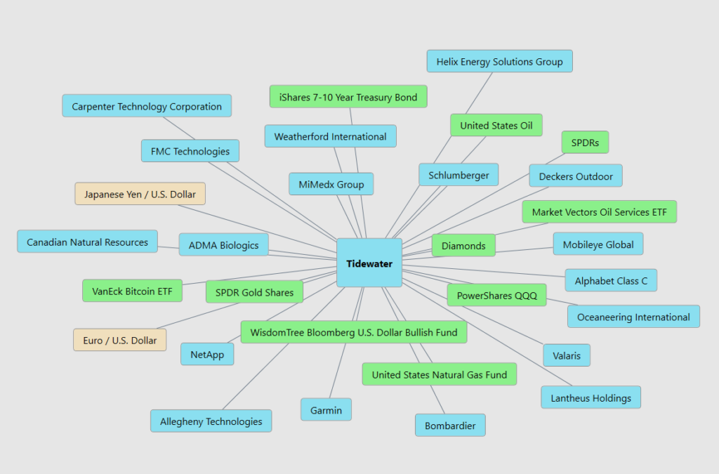 For $TDW, the key price drivers come from several interconnected markets. First is the energy complex itself, including crude oil, oil service companies like Schlumberger and Helix Energy Solutions, and sector ETFs such as the Market Vectors Oil Services ETF. When energy exploration activity expands, demand for offshore services rises, directly benefiting Tidewater’s business. Second are macro commodity and currency influences including gold, diamonds, and major currency pairs like EUR/USD and JPY/USD, which reflect global liquidity and economic activity. Third are broader capital markets such as SPDRs, QQQ, and interest rate instruments like the iShares 7-10 Year Treasury Bond ETF, which signal overall risk appetite and capital rotation. Together these markets form the macro ecosystem that helps determine whether capital is flowing toward offshore energy services or away from it.