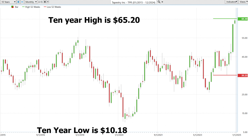 Over the last 10 years $TPR has traded as high as $65.30 and as low as 10.18. One of our favorite trading setups is monitoring very closely stocks and assets that are making new 52 week highs and new all time hgihs. These stocks usually have tremendous momentum and offer massive opportunity for the seasoned trader. Their price action is living proof that they are overcoming all barriers to their success. Currently $TPR is making new 52 week highs and new 10 year highs and is worth putting on your watchlist radar specifically for this reason.