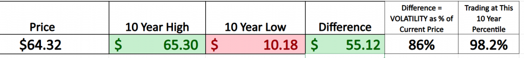 You can measure a stock’s historical volatility precisely by calculating its trading range and expressing it as a percentage of the current price. This simple calculation provides a benchmark to anticipate how volatile the stock might be in the future. Over the past year the annual trading range was $33.10, which represents 51% of the current price. This tells us that moving forward it would be perfectly normal to expect the price to trade 51% higher or lower than we are trading today.