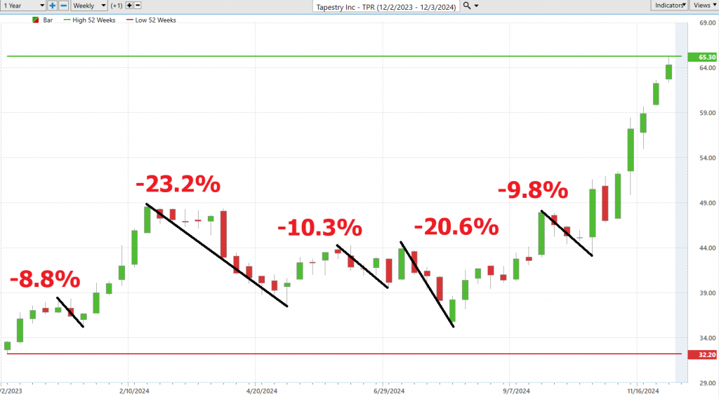 A quick look at these charts gives traders a clear snapshot of the risk-reward dynamics for $TPR, rooted in last year’s price action. But the story gets even more compelling when we zoom out and compare $TPR’s performance to broader market indexes across multiple timeframes. This expanded view highlights where $TPR stands amid the shifting tides of the market. The data speaks for itself — rallies have dwarfed declines, signaling that the bulls remain firmly in control.