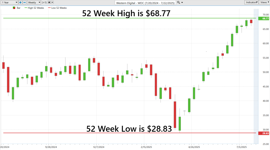 Wall Street currently has a wide range of price targets on the stock. Some analysts see it heading toward the mid-$70s, while others remain cautious, citing macroeconomic headwinds and inventory concerns. But when you analyze that forecast spread relative to the current price, what you’re really seeing is a proxy for forward volatility — a reflection of the high stakes and high variability of the industry. In fact, when you compare that to Western Digital’s 52-week trading range, which spans nearly 50% of the current share price — you realize that the market is already pricing in serious moves, both up and down.