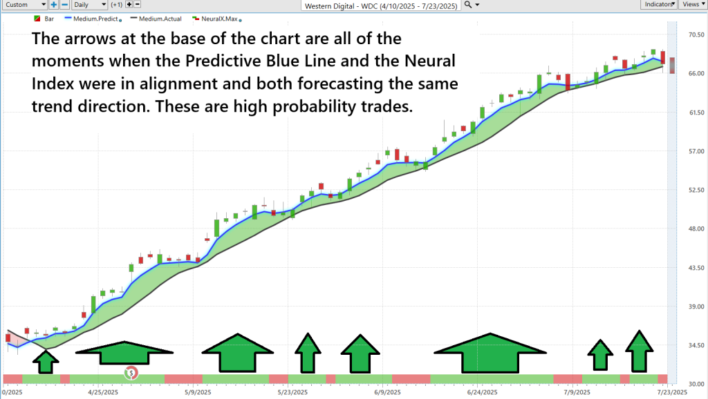 On the chart below the arrows at the base of the chart are all the moments when the Predictive Blue Line and the Neural Index were in alignment and both forecasting the same trend direction. These are high probability trades.