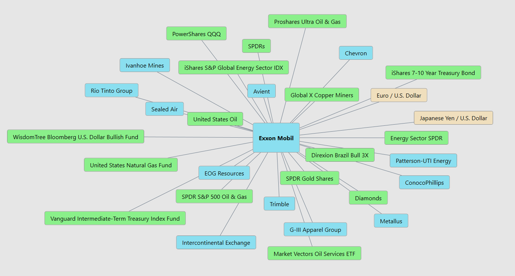 But the story goes deeper. You are also seeing strong linkages to other commodity plays like COPX and global miners, which tells you this is not just an oil trade, it is a broader “real assets” bid. Even gold via GLD is part of the ecosystem, reinforcing the idea that capital is rotating toward tangible assets and away from purely financial ones. That is a macro tailwind that extends beyond Exxon itself.