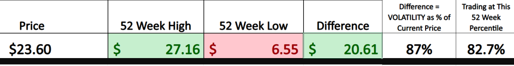 Over the last 52 weeks $XPEV has traded as high as $27.17 and as low as $6.55. This range, which is also the historical volatility, is very important for traders to acknowledge and understand. As a percentage this historical range is 87% of the current price and tells us that should the following 12 months be like the last 12 months it would be perfectly normal to expect $XPEV to trade in a range 87% higher and/or lower than the current level.