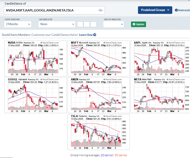 Viewing a watchlist in CandleGlance on StockCharts offers a quick, visual way to scan multiple stocks at once.