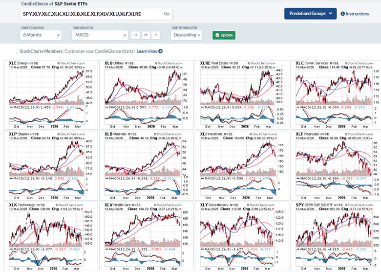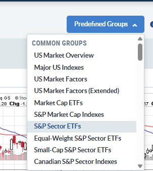 To see what sector is doing well right now, we can select S&P Sector ETFs from the Predefined Groups.