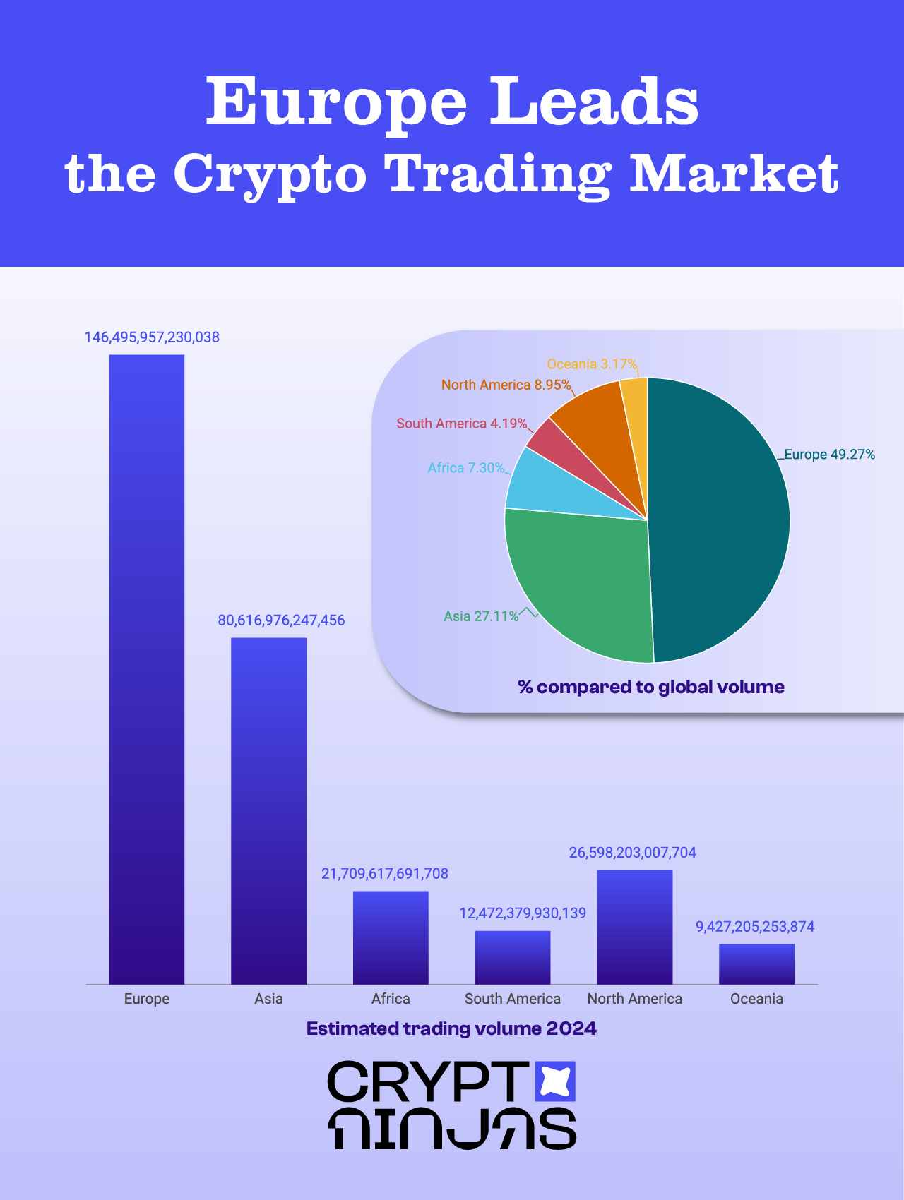 - Europe dominates the market, accounting for half of the world’s total crypto transaction value.
