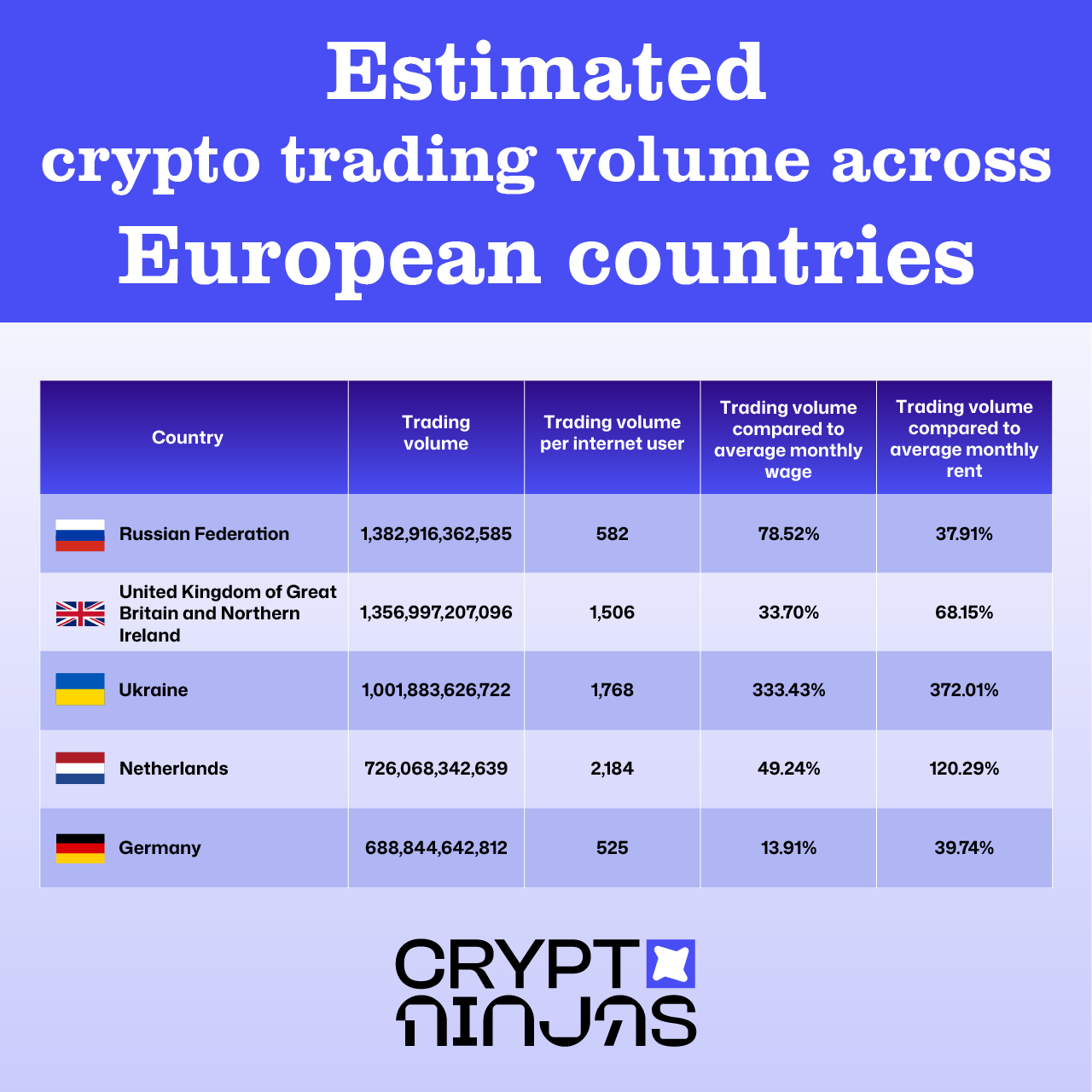 Russia leads European crypto trading, with an estimated volume surpassing $1.38 trillion, ranking it among the top five trading nations globally. The UK follows with $1.36 trillion, driven by London’s status as a key financial hub. Notably, Slovenia and Ukraine stand out for their high individual crypto expenditures, with residents spending more than 3-4 times their monthly rent on digital assets.