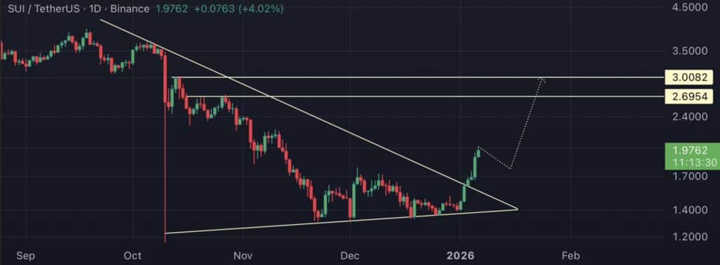 Technical wise is confirming the bullish shift too. This SUI USD daily chart shows a clean breakout from a long descending wedge, which is a bullish structure shift after months of lower highs.