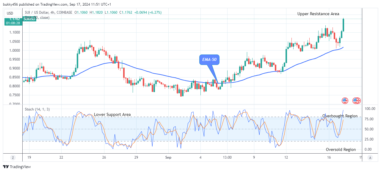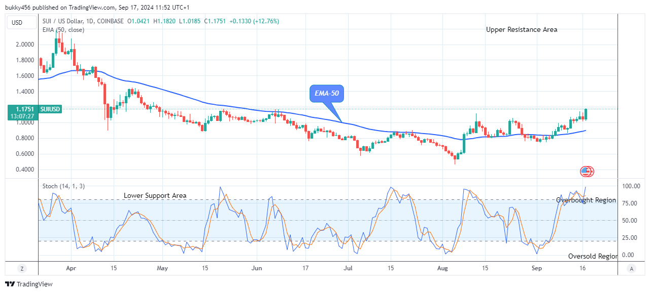 The current price of the SUIUSD pair at the $1.182 resistance level above the EMA-50 as the daily chart opens today indicates a good buy signal and gives room for a more bullish impact on the market, signaling a promising growth ahead.