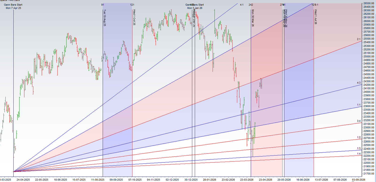 The theme for the broader indices is a spectacular, news-driven breakout that faces a definitive time-cycle test. The opening gap-up shatters near-term resistance, forcing a frantic chase for equities. The Sun entering Taurus supports this bullish repositioning in heavyweights. The indices will be driven higher early in the week, targeting major overhead supply zones. The narrative culminates on Thursday. The Multiple Gann Dates and the Uranian aspect act as a “line in the sand” for the bulls. IF the Nifty and Sensex fail to break and hold above the resistance levels established on Thursday, THEN a sharp, mean-reverting pullback becomes the high-probability outcome for Friday, confirmed by the Bayer Rules.