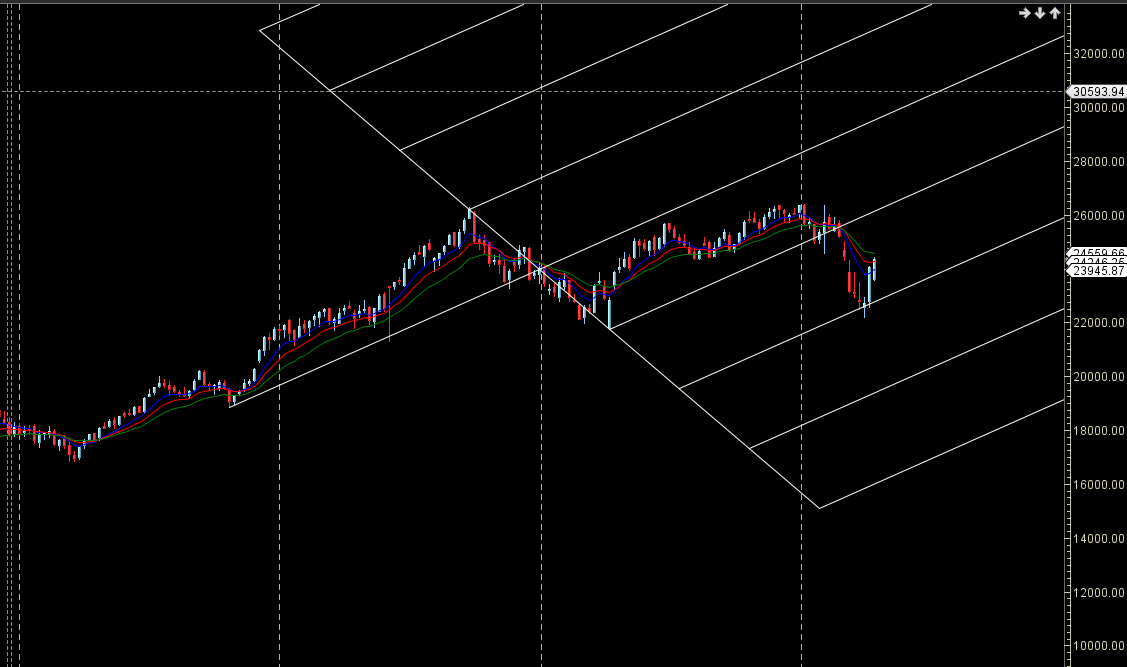 Price is trading above its 2×1 gann angle zone heading towards 24919-24989