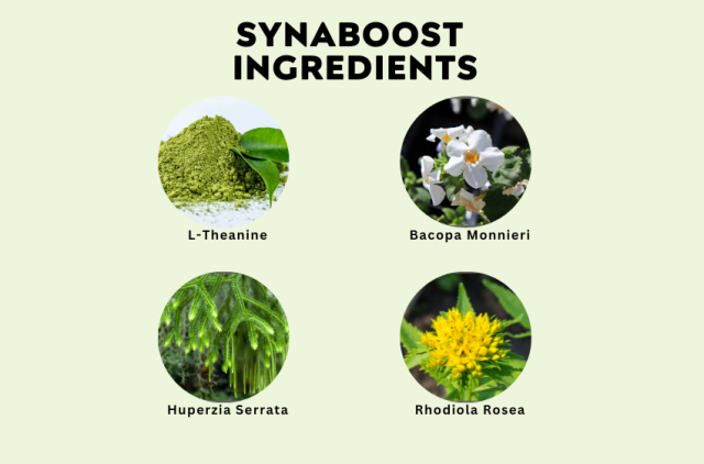 Synaboost contains natural ingredients like Bacopa Monnieri, which supports neuron communication, Huperzia Serrata, which improves memory and learning capability, and L-theanine, reducing stress for better mental sharpness. Together, they enhance overall cognitive performance.
