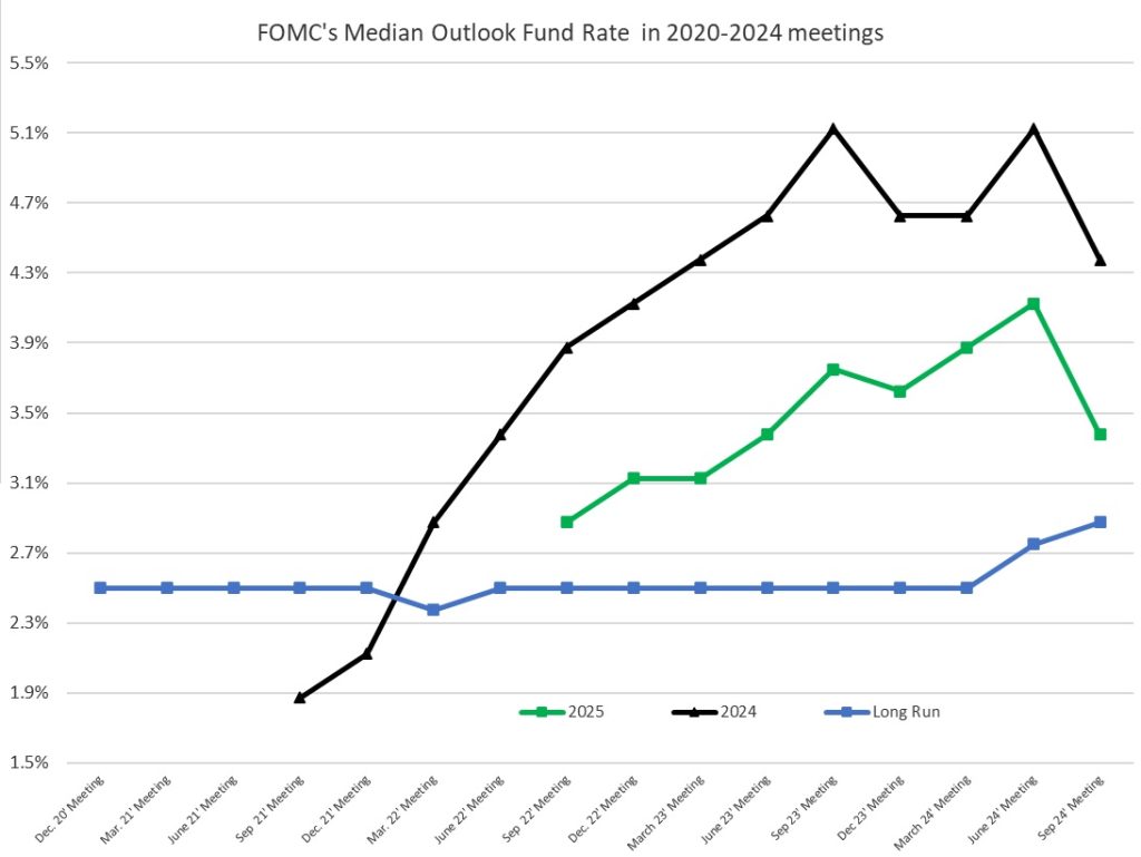 The chart above shows that the FOMC revised down its outlook; again, however, it also raised its R*, which suggests that the FOMC expected it would need to cut less of its short-term policy rate before reaching the neutral rate – thus suggesting the current policy rate is not as constraining the economy as they thought it was before.