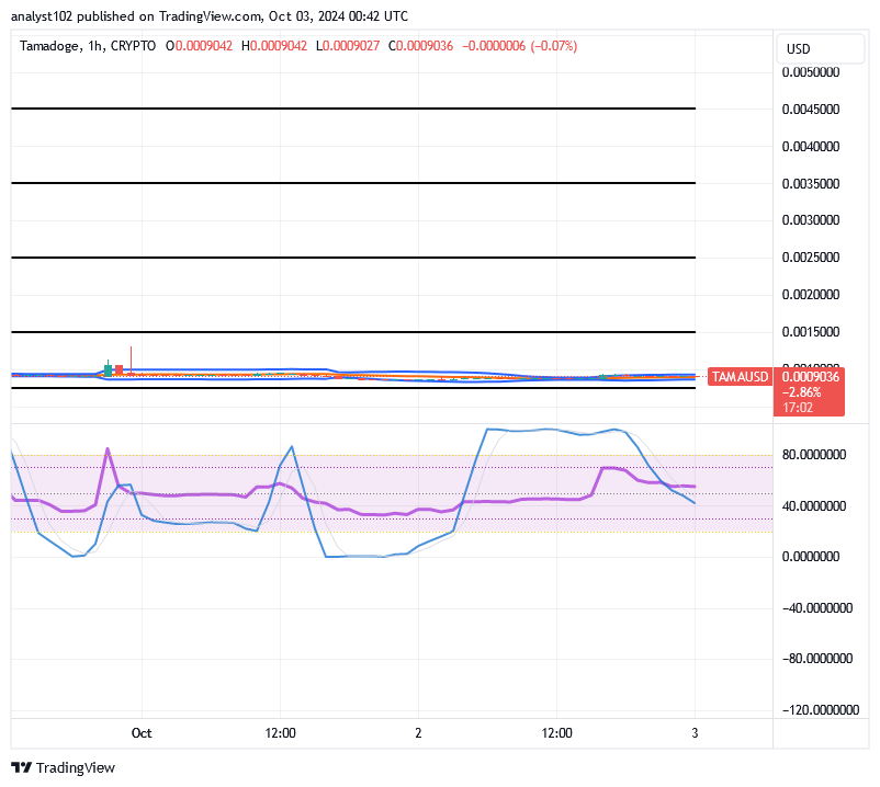 The TAMA/USD short-term chart reveals that the crypto-economic trade is hovering around $0.001 and trying hikes.