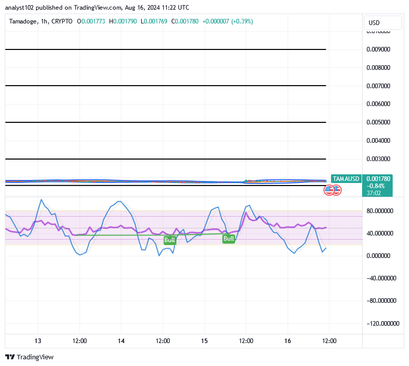 The TAMA/USD short-term chart reveals that the crypto-economic price moves easterly around $0.002, holding up inputs.