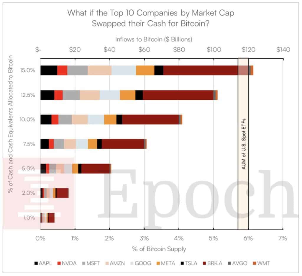 Horsley noted that if the top 10 companies swapped just 5% of their cash for BTC, we’d see $40B in BTC inflows.