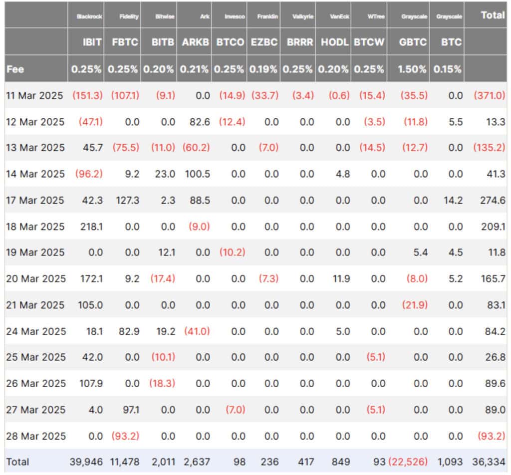 That 10-day ETF inflow streak? It came to a screeching halt on March 28. Fidelity’s spot Bitcoin ETF saw $93 million in outflows that day, while other issuers posted a flatline, according to Farside Investors. Not exactly bullish — but not a mass exodus either.