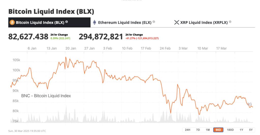 After regaining $100K in January, Bitcoin is down to $84 and looking shaky. Source: BNC Bitcoin Liquid Index
