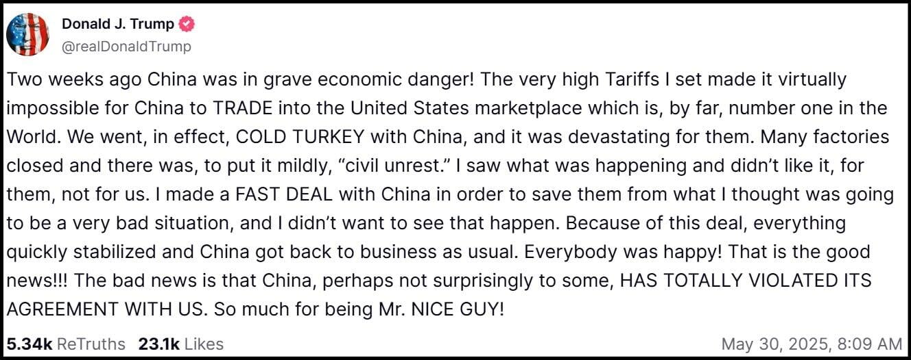 The Trump administration agreed to lower its tariffs on China from above 145% to 30% on May 12, as China returned the favor by cutting 125% tariffs to 10%. On Thursday, however, Treasury Secretary Scott Bessent told Fox News that trade talks were “a bit stalled” and that China’s Xi Jinping would need to speak directly with President Trump.