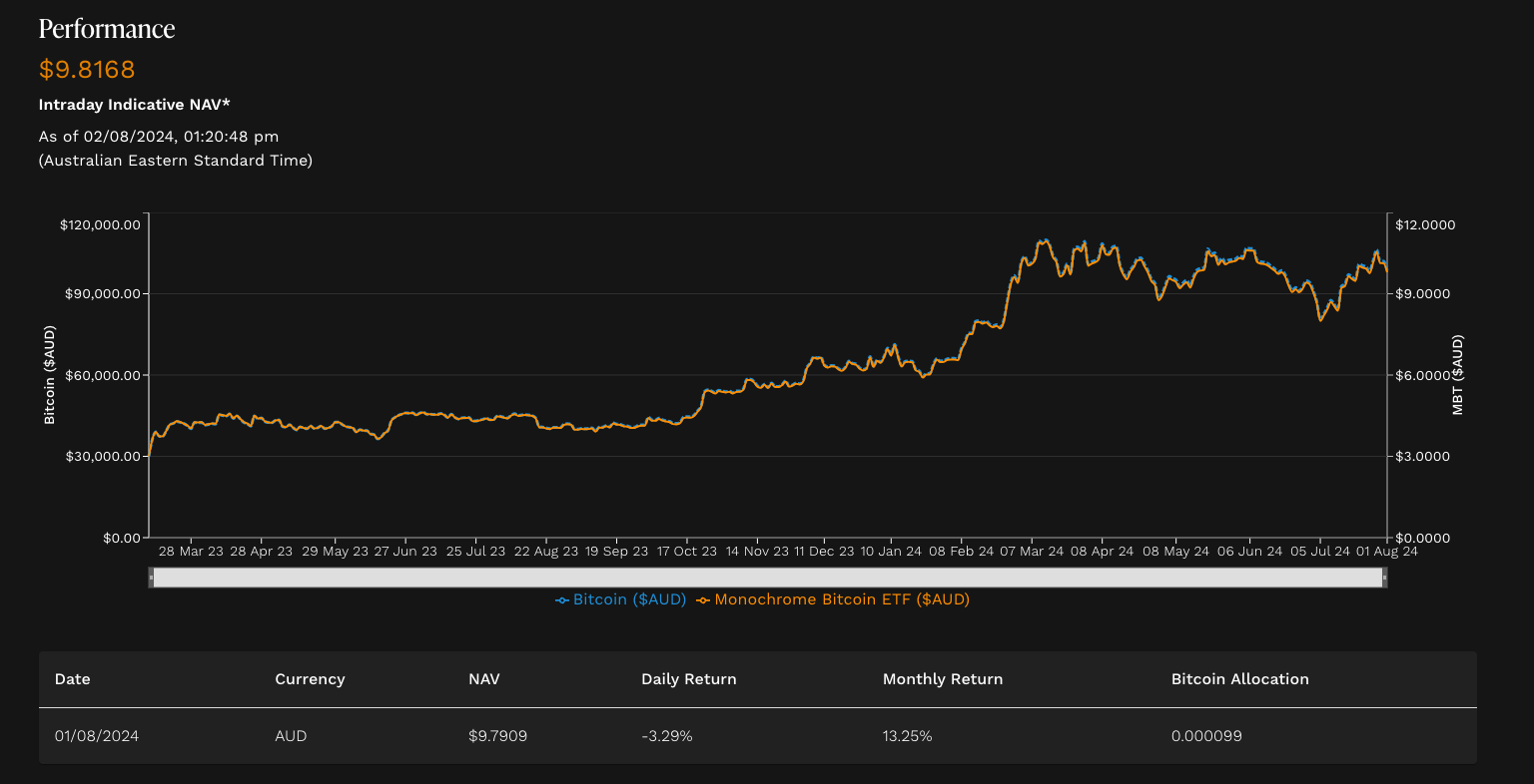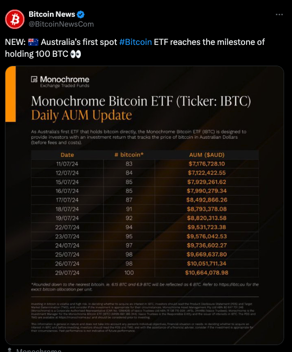 Australia’s first licensed and spot Bitcoin ETF directly holding BTC, the Monochrome Bitcoin ETF (IBTC), has reached a significant milestone, managing over 100 BTC.