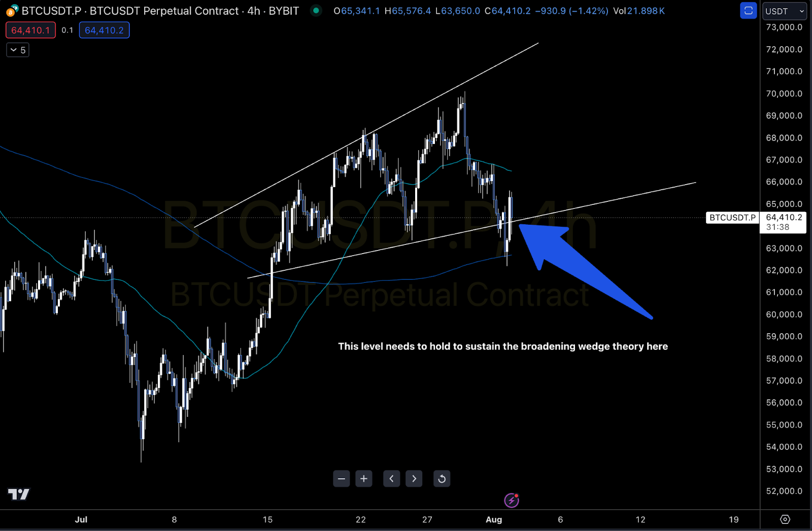 Now, you might be wondering: Is this pattern bullish or bearish? Let me put your mind at ease—this expanding broadening wedge is bullish. But, and it’s a big but, we need to hold the $64,000 zone to keep the bulls happy and ensure we don’t slide into bear territory.