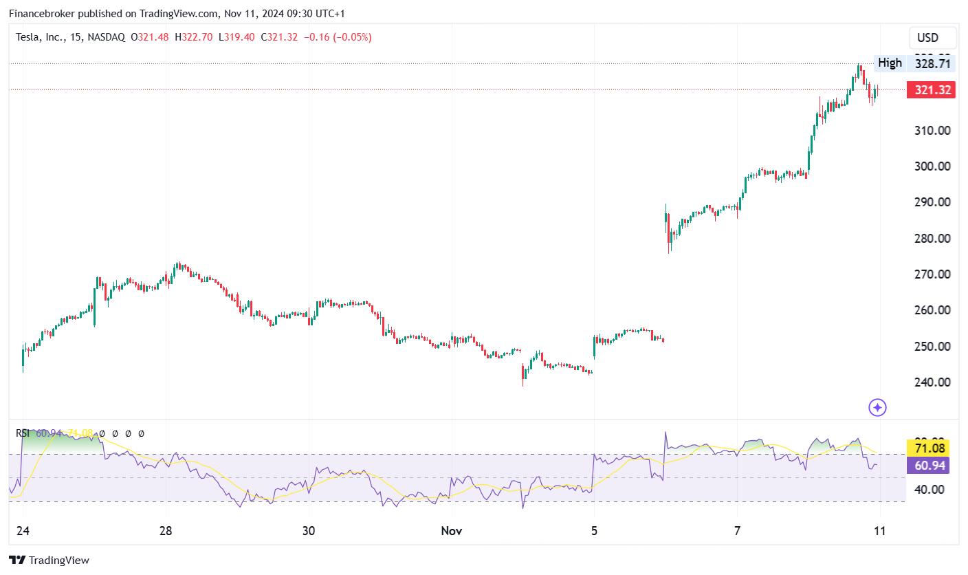 Reviewing the performance of Tesla shares in the chart above, we can observe a robust rally. Very recently, the price surged to over $320. The stock closed at $321.22, marking a massive rise of 8.19%.