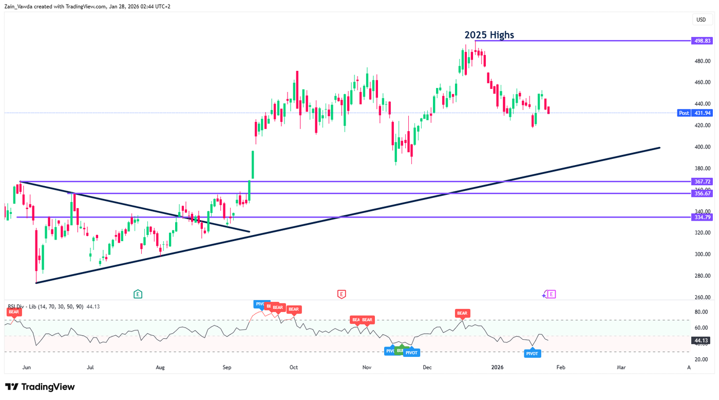 - Bear Case: If margins compress further and AI timelines are pushed back, the stock could test support levels near $380.